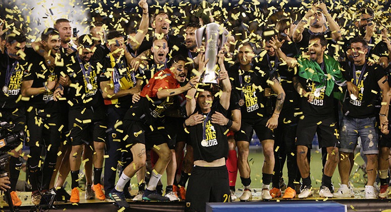 Αμέσως μετά τη λήξη της αναμέτρησης της 30ης αγωνιστική με τον Απόλλωνα Σμύρνης, στήθηκε η εξέδρα για την απονομή των μεταλλίων και ο πρόεδρος της Super League, Γιώργος Στράτος, παρέδωσε στα χέρια του αρχηγού της Ενωσης, Πέτρου Μάνταλου, το τρόπαιο του πρωταθλητή.