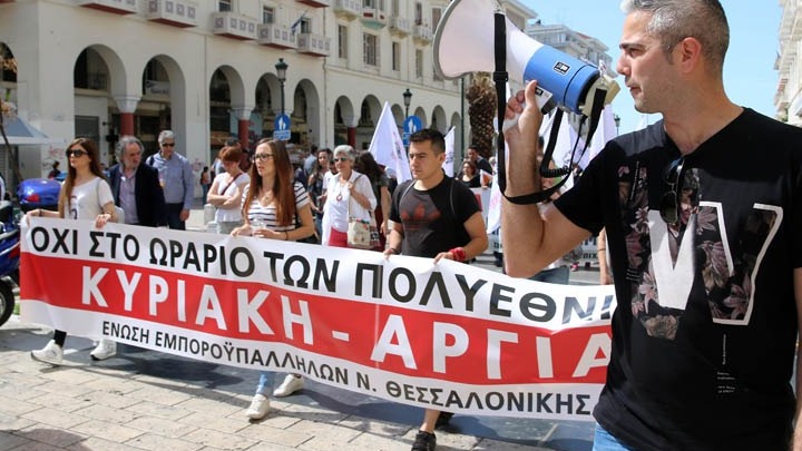 «Η σχεδιασμένη κατάργηση της Κυριακής αργίας συνοδεύεται με μεγάλες καθυστερήσεις στις καταβολές των μισθών, ρεπό που δε δίνονται, με αύξηση της εντατικοποίησης της εργασίας, με ολοένα και λιγότερους εργαζόμενους ιδιαίτερα σε μεγάλους εργασιακούς χώρους να βγάζουν πολλαπλάσια δουλειά, γεγονός που οδηγεί το τελευταίο διάστημα σε αύξηση των εργατικών ατυχημάτων και των επαγγελματικών ασθενειών» αναφέρεται σε ανακοίνωση της Ένωσης Εμποροϋπαλλήλων νομού Θεσσαλονίκης.