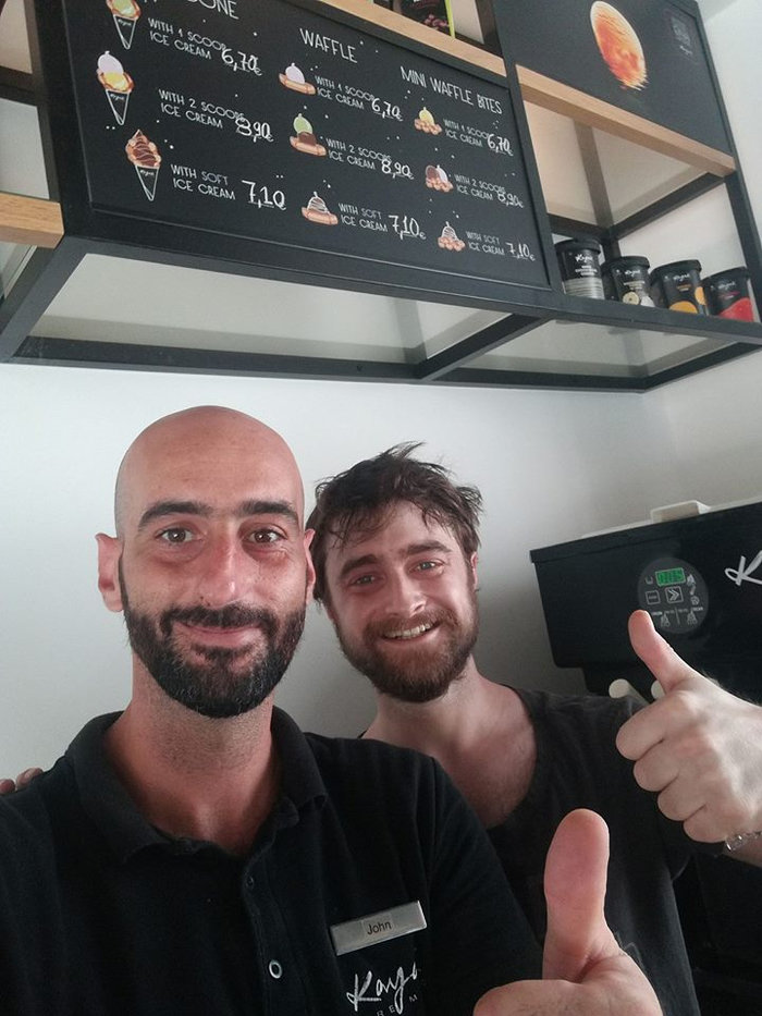 Μάλιστα οι πελάτες του ξενοδοχείου τον αναγνώρισαν και του ζήτησαν να βγάλουν φωτογραφία σε ένα κατάστημα με παγωτό, στην οποία δεν θυμίζει και τόσο τον μικρό μάγο, καθώς έχει μεγαλώσει και έχει αφήσει μακρυά μαλλιά και μούσια.