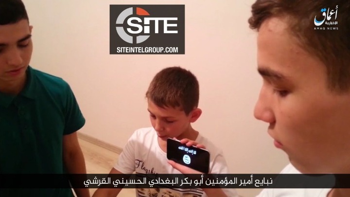 Τρία από τα αγόρια κραδαίνουν μεγάλα μαχαίρια και το νεαρότερο κρατάει ένα τηλέφωνο στην οθόνη του οποίου εμφανίζεται η σημαία των τζιχαντιστών. Μιλώντας ρωσικά, τα παιδιά ορκίζονται πίστη στον ηγέτη του Ισλαμικού Κράτους Αμπού Μπακρ αλ Μπαγκντάντι.