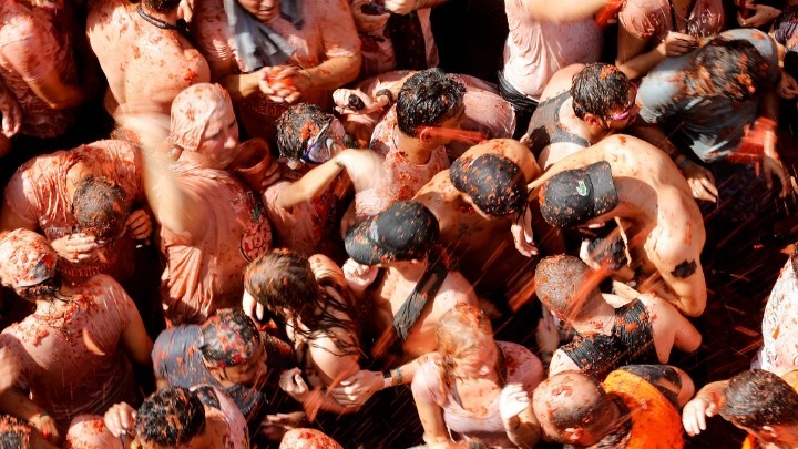 Χιλιάδες γλεντζέδες εκσφενδόνισαν 145 τόνους τομάτες αναμεταξύ τους σήμερα, γιορτάζοντας το ετήσιο φεστιβάλ Tomatina στην πόλη Μπουνιόλ της επαρχίας Βαλένθια στην ανατολική Ισπανία.