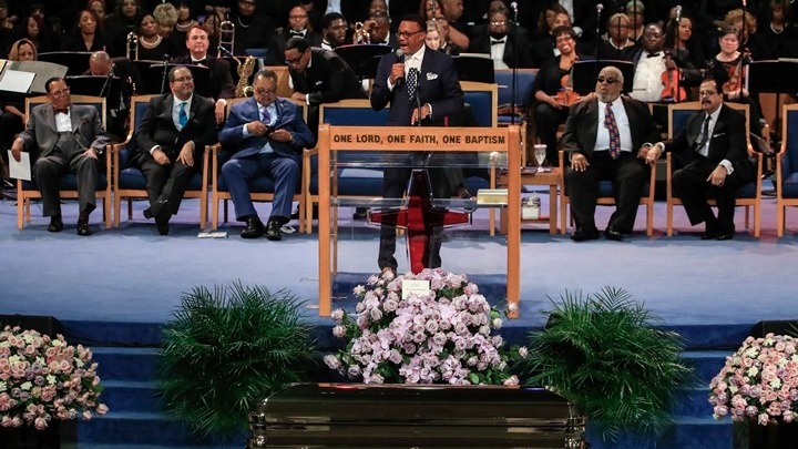 Ο αιδεσιμότατος Τζάσπερ Ουίλιαμς ο νεότερος, πάστορας της «Εκκλησίας Βαπτιστών του Σάλεμ» στην Ατλάντα, ο οποίος επιλέχθηκε λόγω των επικήδειων λόγων που είχε εκφωνήσει κατά το παρελθόν για μέλη της οικογένειας Φράνκλιν, πέρασε όλη την ώρα στο βήμα αναπτύσσοντας κοινωνικά θέματα τα οποία, όπως είπε, είναι καθοριστικά για την κοινότητα των μαύρων.