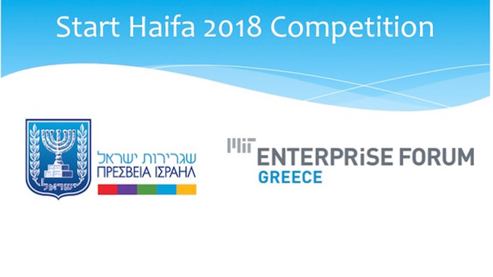Η Πρεσβεία του Ισραήλ και το MIT Enterprise Forum Greece συνδιοργανώνουν τον διαγωνισμό «Start Haifa 2018» για εκπροσώπους ελληνικών νεοφυών επιχειρήσεων στο χώρο της τεχνολογίας και των επιστημών. Στόχος του διαγωνισμού είναι να επιλεγεί η καλύτερη ομάδα που θα εκπροσωπήσει την Ελλάδα σε αποστολή startup εταιριών από διάφορες χώρες του κόσμου στις εργασίες του «Start Haifa 2018» στο Ισραήλ.
