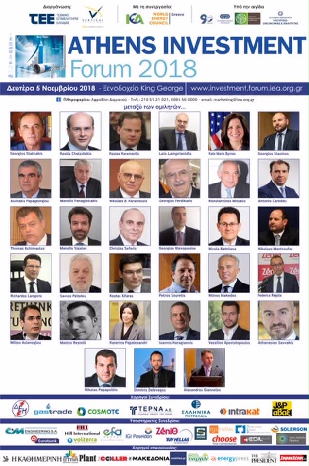 Υψηλού κύρους ομιλητές, διακεκριμένα μέλη της επίσημης Πολιτείας, και επιτυχημένοι εκπρόσωποι του επιχειρηματικού κόσμου της χώρας, τιμούν με την παρουσία τους το Athens Investment Forum 2018:Ο ρόλος των Ελληνικών Επιχειρήσεων στη Μελλοντική Ανάπτυξη, που πραγματοποιείται τη Δευτέρα 5 Νοεμβρίου 2018, στο Ξενοδοχείο King George στην Αθήνα.