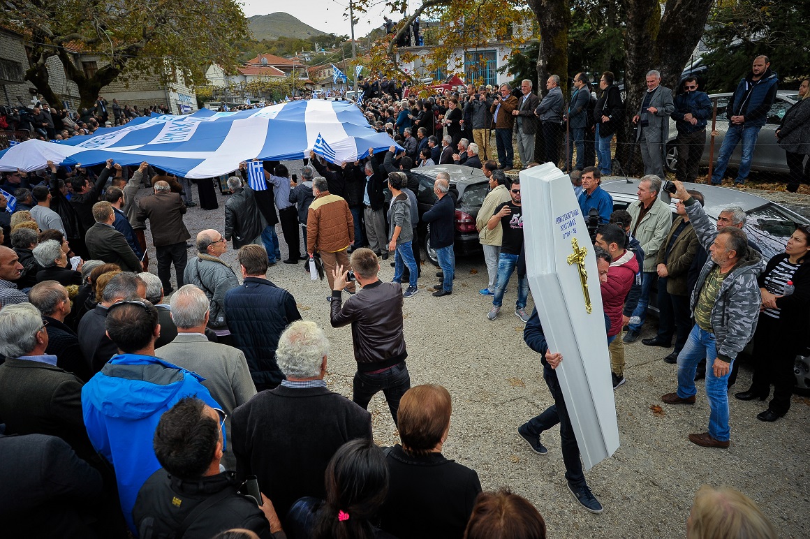 Η νεκρώσιμη ακολουθία εψάλη σε κλίμα οδύνης και θρήνου στον ιερό ναό του Αγίου Αθανασίου, ενώ νωρίτερα, η σορός είχε τεθεί στην κεφαλή της νεκρικής πομπής με την οικογένεια του 35χρονου Κωνσταντίνου Κατσίφα να τον «ακολουθεί» στην τελευταία διαδρομή του στο χωριό που γεννήθηκε.