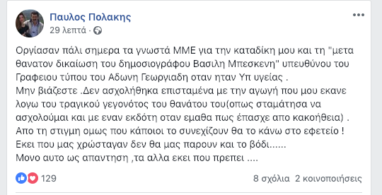 Με μια πρωτοφανή, ανήθικη και απαράδεκτη απάντησή του στο FB επέλεξε ο αν Υπουργός υγείας Παύλος Πολάκης να σχολιάσει την καταδίκη του για τα ψεύδη και τις συκοφαντίες που είχε παραθέσει (όπως χαρακτήρισε όσα είπε η δικαιοσύνη) για τη σχέση του αείμνηστου Β.Μπεσκένη με το ΚΕΕΛΠΝΟ.
