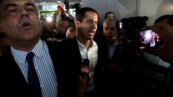 Ο αυτοανακηρυχθείς πρόεδρος είχε αναγγείλει την επιστροφή του στην πρωτεύουσα της Βενεζουέλας και προειδοποίησε χθες την κυβέρνηση του Νικολάς Μαδούρο εναντίον οποιασδήποτε απόπειρας να τον «απαγάγει» μόλις αφιχθεί.