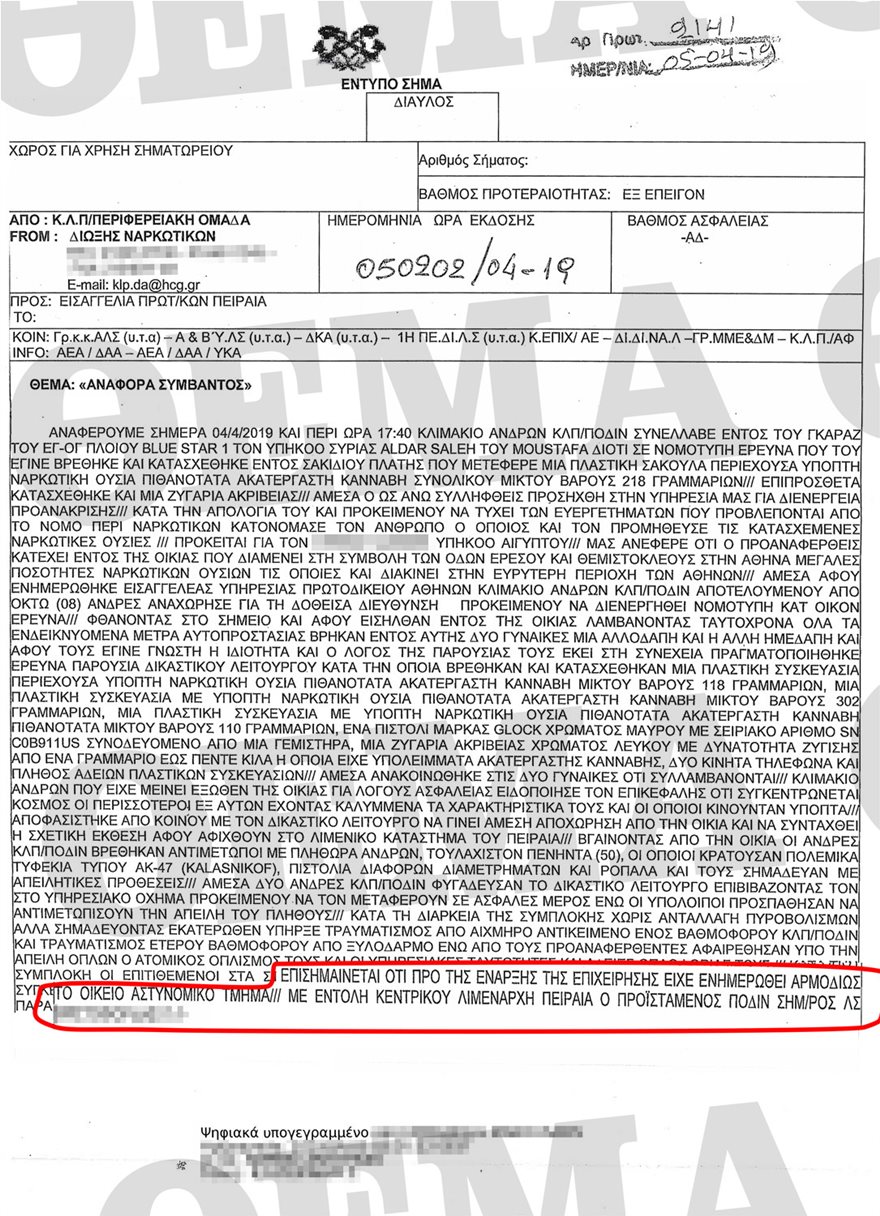 Όμως σύμφωνα με την αναφορά του Λιμενικού, την οποία δημοσιεύει το protothema.gr, η ΕΛ.ΑΣ είναι έκθετη καθώς είχε ενημερωθεί για την επιχείρηση αλλά δεν είχε δυνάμεις για να διαθέσει εγκαίρως στους αξιωματικούς του λιμενικού που πήγαν στο στόμα του λύκου, αντιμετωπίζοντας ομάδες ατόμων, που κρατούσαν καλάζνικοφ: «Βγαίνοντας από την οικία, οι άνδρες ΚΛΠ/ΠΟΔΙΝ βρέθηκαν αντιμέτωποι με πληθώρα ανδρών, τουλάχιστον 50, οι οποίοι κρατούσαν πολεμικά τυφέκια τύπου ΑΚ-47 (καλάζνικοφ), πιστόλια διαφόρων διαμετρημάτων και ρόπαλα και τους σημάδευαν με απειλητικές προθέσεις. Άμεσα δύο άνδρες ΚΛΠ/ΠΟΔΙΝ φυγάδευσαν τον δικαστικό λειτουργό επιβιβάζοντάς τον στο υπηρεσιακό όχημα, προκειμένουν να τον μεταφέρουν σε ασφαλές μέρος, ενώ οι υπόλοιποι προσπάθησαν να αντιμετωπίσουν την απειλή του πλήθους».