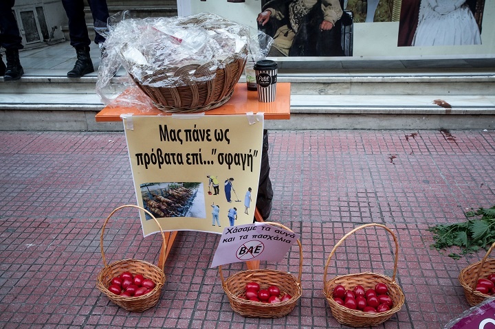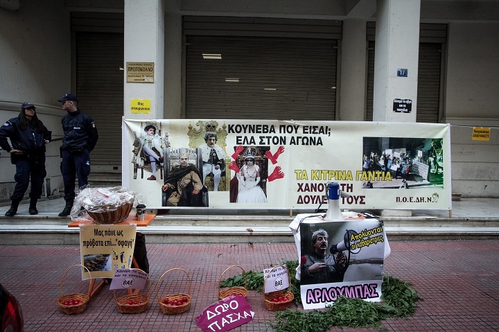 Σε ένα πανό απεικονίζεται ο Παύλος Πολάκης με ντουντούκα και από κάτω γράφει: «Αρλούμπας», ενώ σε άλλο πανό οι καθαρίστριες γράφουν «μας πάνε ως πρόβατα επί… “σφαγή”».