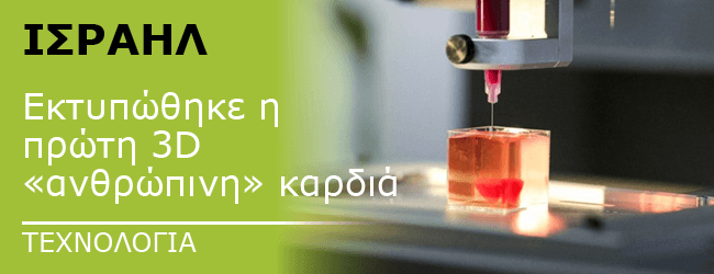 Επιστήμονες παρουσίασαν στο Τελ Αβίβ ένα πρωτότυπο ανθρώπινης καρδιάς τρισδιάστατης εκτύπωσης από ανθρώπινους ιστούς και με αγγεία, μια «μείζων» πρόοδος, σύμφωνα με τους ίδιους, για τη θεραπεία καρδιαγγειακών νόσων και την πρόληψη της απόρριψης μοσχευμάτων. Οι ερευνητές του πανεπιστημίου του Τελ Αβίβ παρουσίασαν στους δημοσιογράφους αυτή την αδρανή καρδιά μεγέθους κερασιού, βυθισμένη μέσα σ’ ένα υγρό.