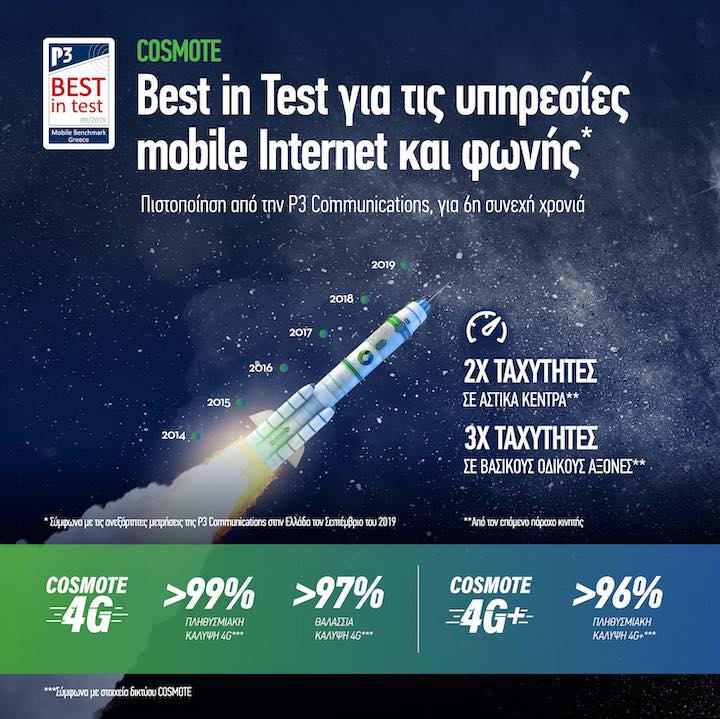 Σύμφωνα με τις μετρήσεις που πραγματοποιήθηκαν από τις 4 έως τις 19 Σεπτεμβρίου 2019, το δίκτυο κινητής COSMOTE πέτυχε τη μεγαλύτερη επίδοση στην Ελλάδα, συνολικά, αλλά και στις επιμέρους αξιολογήσεις των υπηρεσιών mobile Internet και φωνής. Συγκεκριμένα, οι επιδόσεις του δικτύου COSMOTΕ αξιολογήθηκαν από την P3 Communications ως οι καλύτερες στην Ελλάδα με 897 πόντους (στην κλίμακα 1 έως 1000), με το αμέσως επόμενο δίκτυο στους 737.