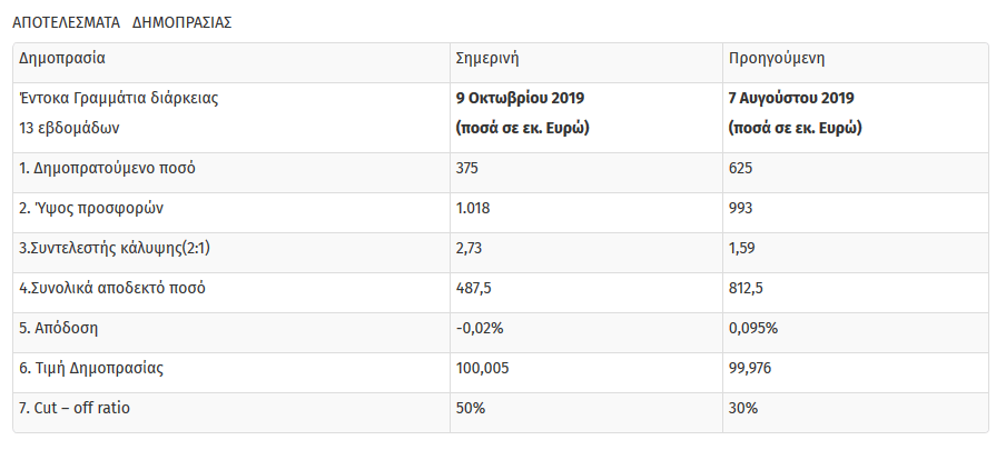 Σήμερα διενεργήθηκε δημοπρασία εντόκων γραμματίων διάρκειας 13 εβδομάδων, ύψους 375 εκατομμυρίων Ευρώ. Η απόδοση διαμορφώθηκε στο -0,02%. Υποβλήθηκαν συνολικές προσφορές ύψους 1.018 εκατομμυρίων Ευρώ, που υπερκάλυψαν το ζητούμενο ποσό κατά 2,73 φορές.