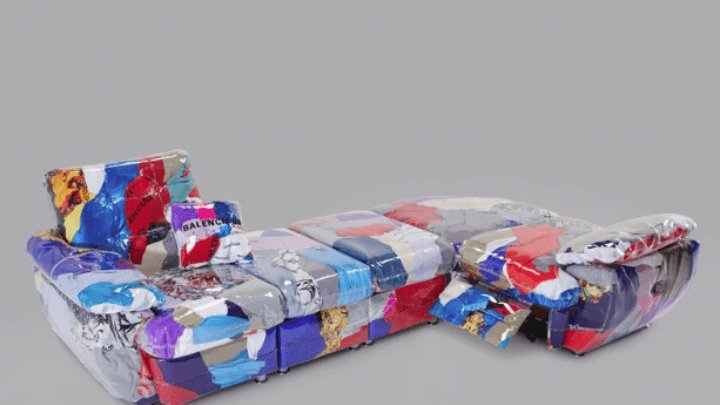 «Ο “Balenciaga Sofa” ξαναφαντάζεται τον καναπέ ως παράδειγμα ντιζάιν με περιβαλλοντική συνείδηση, δίνοντας μια καινούργια ζωή σε γενιές ενδυμάτων και άλλων υλικών» επισημαίνεται στην ανακοίνωση του οίκου ειδών πολυτελείας. «Το κάλυμμά του είναι από ελαττωματικά ενδύματα ή ενδύματα που δεν μπορούν να πωληθούν, καθώς και από ρετάλια από παλιές κρεασιόν του οίκου, όλα αυτά μέσα σε διαφανές βινύλιο. Τα μοτίβα και το κόψιμο είναι αναγνωρίσιμα του οίκου, ένα μείγμα παλιών περιόδων και ιδεών».