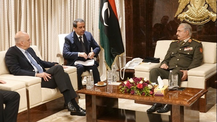 Ο Υπουργός Εξωτερικών, Νίκος Δένδιας, μετέβη σήμερα το πρωί στη Βεγγάζη της Λιβύης, όπου συναντήθηκε με τον επικεφαλής του Λιβυκού εθνικού στρατού, στρατάρχη Χαλίφα Χάφταρ, σύμφωνα με ανακοίνωση του υπουργείου.
