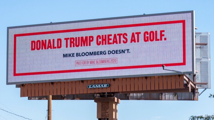 «Ο Ντόναλντ Τραμπ κλέβει στο γκολφ». «Το τείχος του Τραμπ έπεσε»: Ο Μάικλ Μπλούμπεργκ χλεύασε τον άνδρα που ευελπιστεί να εκτοπίσει από τον Λευκό Οίκο με καταχωρήσεις του σε τεράστιες διαφημιστικές πινακίδες που εμφανίστηκαν χθες Παρασκευή στο Λας Βέγκας, όπου βρίσκεται ο Αμερικανός πρόεδρος.