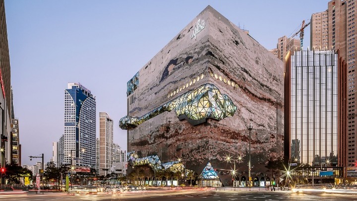 Στην αναπτυσσόμενη πόλη Gwanggyo, περίπου 25 χιλιόμετρα νότια της Σεούλ, πρωτεύουσας της Νότιας Κορέας, ένα ποιοτικό πολυκατάστημα ορθώνεται πλέον ανάμεσα στα γκρίζα κτήρια γραφείων. Σχεδιασμένο από το αρχιτεκτονικό γραφείο OMA, χαρακτηρίζεται από πέτρινη πρόσοψη στην οποία έχει λαξευθεί μια πολυεδρική υάλινη στοά.
