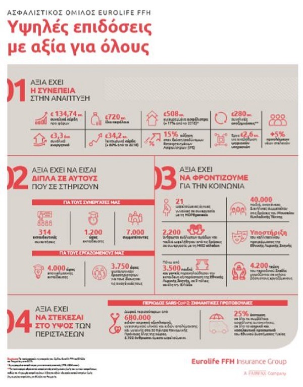 Ένα ιδιαίτερα παραγωγικό έτος, με θετική οικονομική αποτίμηση, ήταν το 2019 για τον Όμιλο Eurolife FFH, μέλος της Fairfax Financial Holdings Limited. Οι σημαντικές του επιδόσεις, σε συνδυασμό με μια σειρά από νέες πρωτοβουλίες και έργα, θέτουν τα θεμέλια για μια σθεναρή αντιμετώπιση των προκλήσεων της τρέχουσας χρονιάς. Για τον Όμιλο Eurolife FFH, αξία έχει να βρίσκεται στο πλευρό των ανθρώπων που εμπιστεύονται τα προϊόντα και τις υπηρεσίες του, πελάτες και συνεργάτες, με στόχο να τους ενδυναμώνει να καταφέρνουν περισσότερα καθημερινά.