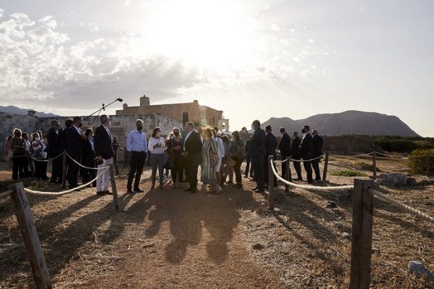 Στην Άπτερα, μια από τις σημαντικότερες πόλεις-κράτη της Κρήτης, που αποκαλύπτεται σταδιακά με τις ανασκαφές, τους υποδέχτηκε η υπουργός Πολιτισμού και Αθλητισμού, Λίνα Μενδώνη και μαζί με την Έφορο Χανίων, Ελένη Παπαδοπούλου, τους ξενάγησαν στα μνημεία.