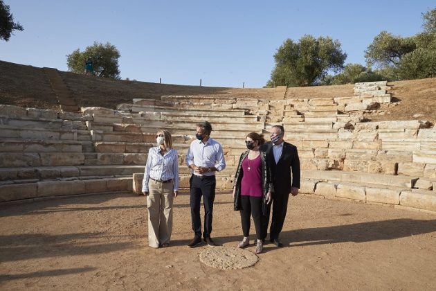 Στο αρχαίο θέατρο της Απτέρας, οι κ. Μητσοτάκης και Πομπέο, συνοδευόμενοι από τις συζύγους τους, στάθηκαν στη θυμέλη, στο κέντρο της ορχήστρας του θεάτρου (το οποίο χρονολογείται από την ελληνιστική περίοδο) και είχαν την ευκαιρία να επιβεβαιώσουν την εξαιρετική ακουστική του χιλιάδες χρόνια μετά την οικοδόμησή του.