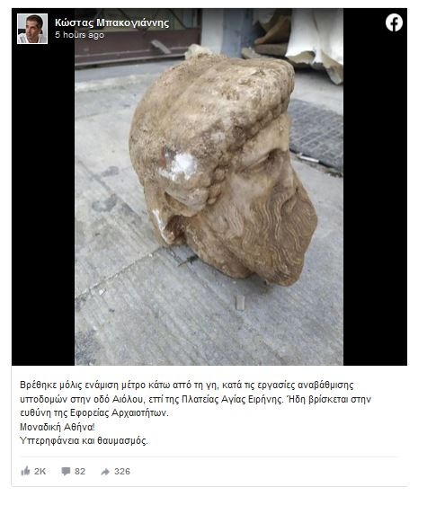 Το συνεργείο του Δήμου Αθηναίων που εκτελούσε εργασίες στην οδό Αιόλου ανακάλυψε μια μοναδική αρχαία κεφαλή κάτω από την επιφάνεια του δρόμου. Αμέσως παραδόθηκε στην Εφορεία Αρχαιοτήτων.