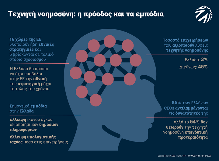 Η Ελλάδα προετοιμάζει κάποιο εθνικό σχέδιο, χωρίς ωστόσο μια δομημένη διαβούλευση με τις επιχειρήσεις και την ερευνητική κοινότητα. Η χώρα βρίσκεται στην 23η θέση του σχετικού δείκτη της Ε.Ε. (Government AI Readiness Index), όταν ήδη 16 χώρες της ΕΕ υλοποιούν προγράμματα μεγάλης κλίμακας και 5 είναι σε τελικό στάδιο σχεδιασμού.