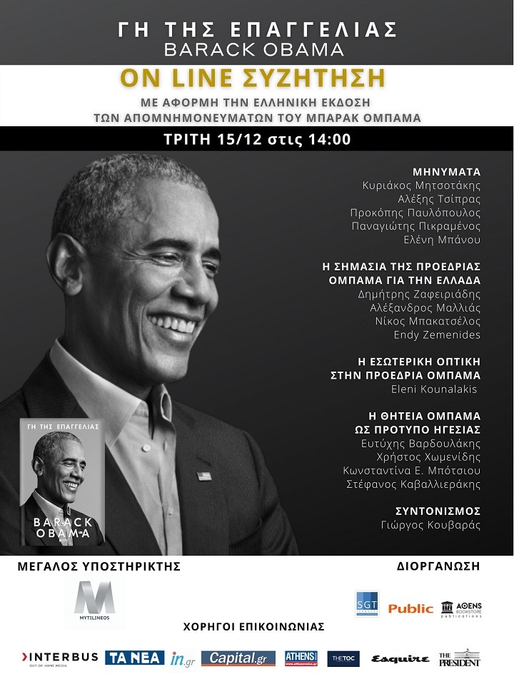 Η εκδήλωση διοργανώνεται από το Public.gr και την Σ.Τσομόκος Α.Ε., και θα μεταδοθεί απευθείας μέσω της πλατφόρμας του Public, της σελίδας obamabook.gr και μέσω της πλατφόρμας https://www.crowdcast.io/e/bobook.