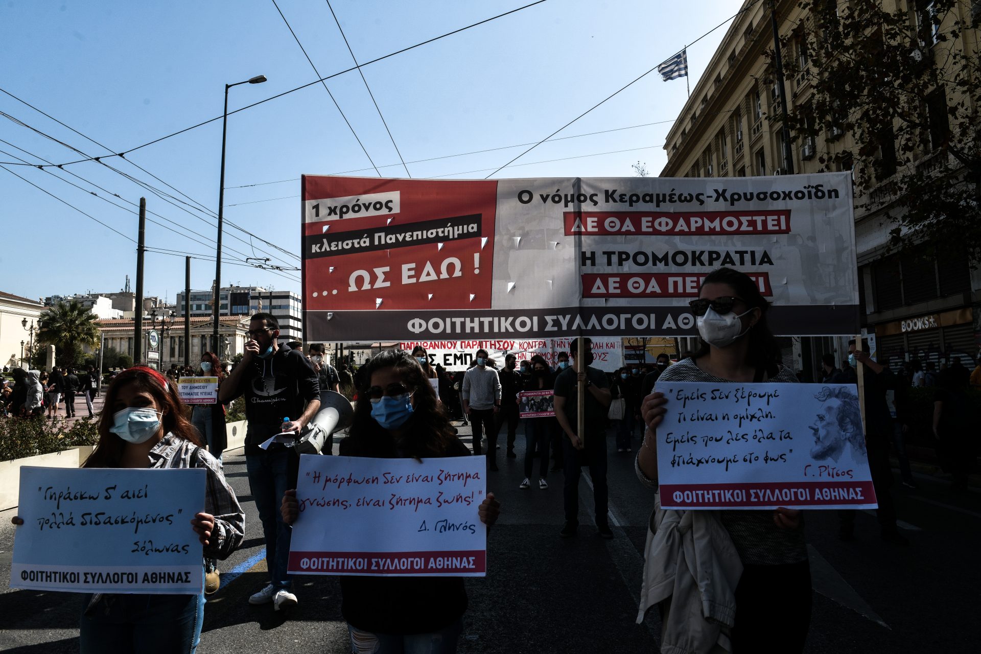 Φοιτητές και εκπαιδευτικοί έχουν συγκεντρωθεί στα Προπύλαια, έναν χρόνο μετά το κλείσιμο πανεπιστημίων και σχολείων και την έναρξη της εξ αποστάσεως λειτουργίας τους.
