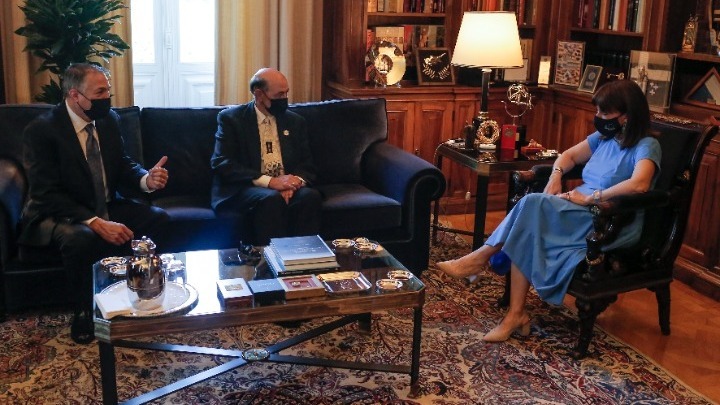 Η Πρόεδρος της Δημοκρατίας Κατερίνα Σακελλαροπούλου συναντήθηκε σήμερα με τους πολιτειακούς γερουσιαστές των ΗΠΑ, Leonidas Raptakis από την Πολιτεία του Ρόουντ Άιλαντ και Stephan Pappas από την Πολιτεία του Ουαϊόμινγκ, στο Προεδρικο Μέγαρο.