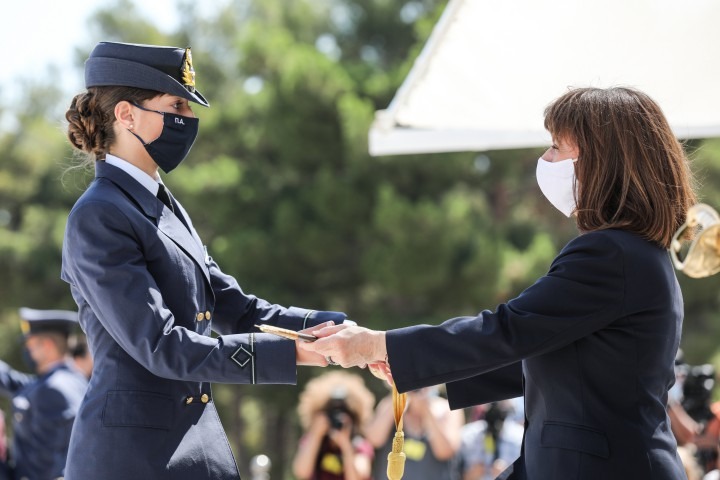 Η Πρόεδρος της Δημοκρατίας, Κατερίνα Σακελλαροπούλου, επέδωσε, σήμερα, Δευτέρα 12 Ιουλίου, τα ξίφη στους νέους και τις νέες ανθυποσμηναγούς, κατά τη διάρκεια τελετής στις εγκαταστάσεις της Σχολής Ικάρων, στην αεροπορική βάση Δεκέλειας, στο Τατόι.