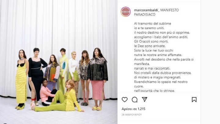 Υπό την προστασία του παίρνει αναδυόμενους σχεδιαστές μόδας ο οίκος Valentino και προσφέρει τον λογαριασμό του στο Instagram ως πλατφόρμα ανάδειξης ενός από αυτούς κάθε σεζόν. Τον επόμενο Φεβρουάριο, κατά τη διάρκεια της Milan Design Week, οι 15,7 εκατομμύρια followers του Valentino στο Instagram θα αρχίσουν να απολαμβάνουν τις κρεασιόν του Marco Rambaldi. Και η πρωτοβουλία φιλοξενίας θα έχει συνέχεια με συνεργασία του Valentino με την Camera della Moda Italiana, το ιταλικό ισοδύναμο του British Fashion Council.