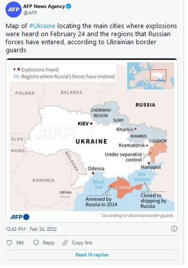 Ο Ουκρανός υπουργός Εξωτερικών, Ντμίτρο Κουλέμπα, δήλωσε ότι η Ρωσία έχει εξαπολύσει μια ευρείας κλίμακας επίθεσης εναντίον της Ουκρανίας από πολλές κατευθύνσεις και πρόσθεσε ότι οι ουκρανικές ένοπλες δυνάμεις αντιστέκονται στην επίθεση.
