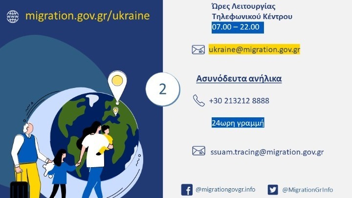 Το υπουργείο Μετανάστευσης και Ασύλου έθεσε σε λειτουργία τηλεφωνικό κέντρο για την παροχή πληροφοριών στους Ουκρανούς πρόσφυγες. Στην τηλεφωνική γραμμή +302131629600 που λειτουργεί στην ουκρανική, ελληνική και αγγλική γλώσσα (Δευτέρα έως Παρασκευή, 7 π.μ.- 10 μ.μ.), μέσω της ιστοσελίδας https://migration.gov.gr/ukraine/ αλλά και μέσω ηλεκτρονικού ταχυδρομείου ([email protected]) οι εκτοπισθέντες πολίτες της Ουκρανίας θα μπορούν να ενημερώνονται για θέματα που τους αφορούν.