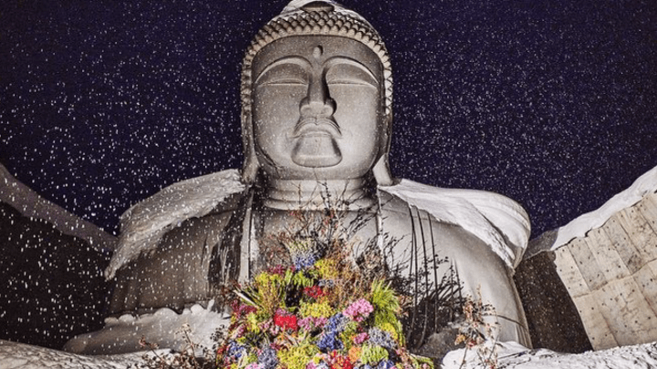 Τοποθετημένο στα χέρια του Βούδα λες και το κρατά, το γλυπτό μπουκέτο από λουλούδια είναι αφιερωμένο από τον Azuma Makoto με μια ευχή για παγκόσμια ειρήνη.