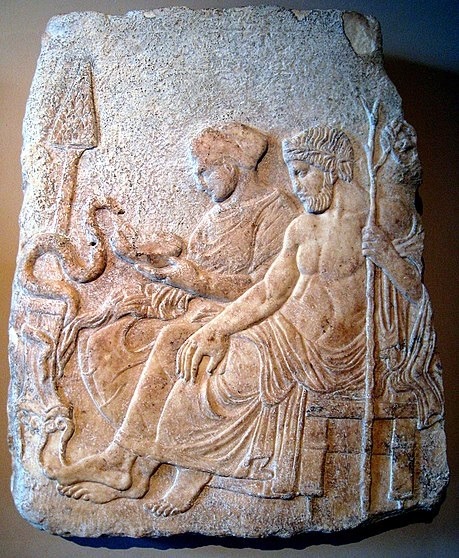 -Το «Ανάγλυφο του Αμαξά» βρέθηκε στο ιερό του Ασκληπιού. Συγκολλήθηκε από τρία κομμάτια και συμπληρώθηκε. Σε αυτό, ο Ασκληπιός, η κόρη του Υγεία και, πιθανώς, η σύζυγός του Ηπιόνη δέχονται τις ευχαριστίες του Αντιμέδοντος, ενός αμαξά τον οποίο ο θεός έσωσε όταν ανατράπηκε το κάρο με το οποίο μετέφερε φορτίο λίθων.