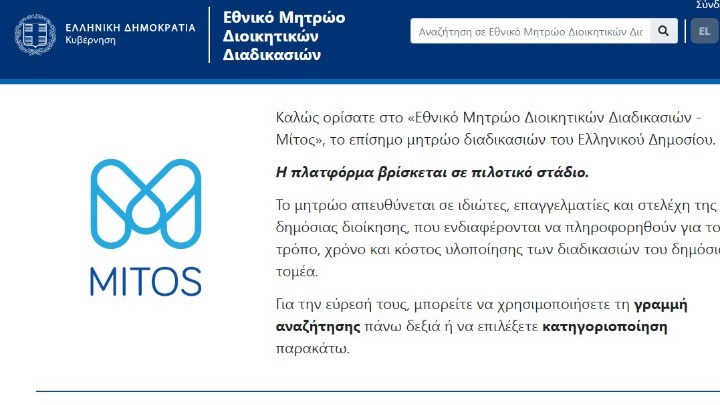 Υπενθυμίζεται ότι το Εθνικό Μητρώο Διοικητικών Διαδικασιών «Μίτος» (mitos.gov.gr) παρουσιάστηκε και τέθηκε σε πιλοτική λειτουργία στις αρχές του περασμένου Ιουλίου και επιτρέπει στον πολίτη να γνωρίζει εκ των προτέρων τι ακριβώς απαιτείται προκειμένου να εξυπηρετηθεί. Η καταχώριση κάθε διαδικασίας ολοκληρώνεται με την απόδοση ενός μοναδικού κωδικού αριθμού, ο οποίος αποτελεί την ταυτότητα κάθε διαδικασίας στο Εθνικό Μητρώο Διαδικασιών.