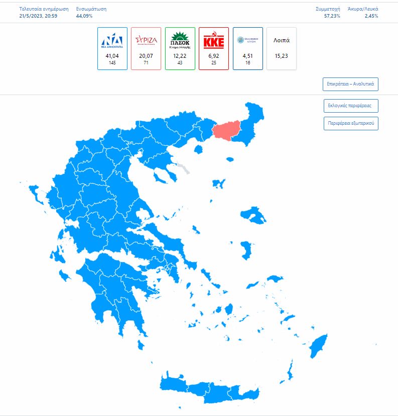 Η ΝΔ με 40,80% και 145 έδρες, ΣΥΡΙΖΑ-ΠΣ 20,07% και 72 έδρες, ΠΑΣΟΚ-ΚΙΝΑΛ 11,59% και 41 έδρες, ΚΚΕ 7,18% και 26 έδρες, Ελληνική Λύση με 4,46% και 16 έδρες, Νίκη με 2,93%, Πλεύση με 2,86% και Μέρα25 με 2,57%.