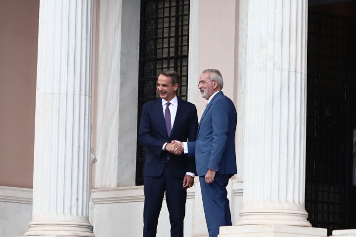 Αμέσως μετά το τέλος της ορκωμοσίας στο Προεδρικό Μέγαρο, ο Κυριάκος Μητσοτάκης πήγε στο Μέγαρο Μαξίμου, όπου τον υποδέχθηκε στην είσοδο ο υπηρεσιακός πρωθυπουργός Ιωάννης Σαρμάς για να του παραδώσει τα καθήκοντα.