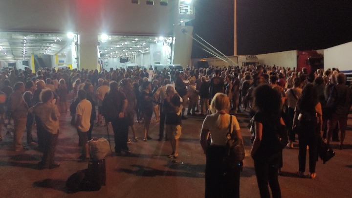 Την έντονη διαμαρτυρία τους εκφράζουν εκατοντάδες χανιώτες στον εμπορικό Λιμένα της Σούδας, έξω ακριβώς από τον καταπέλτη εισόδου του οχηματαγωγού επιβατηγού πλοίου Ελευθέριος Βενιζέλος το οποίο αναχωρεί σύμφωνα με τον προγραμματισμό για τον Πειραιά στις 10:00 το βράδυ.