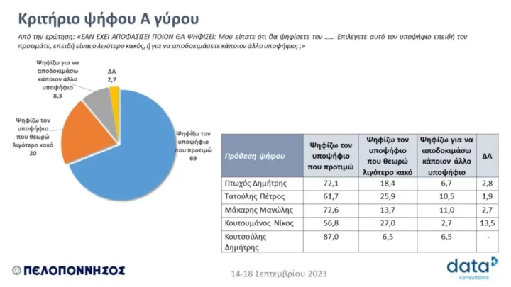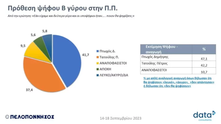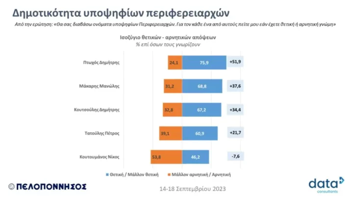 Δύο εβδομάδες πριν τις εκλογές για Περιφερειάρχη η DATA C καταγράφει για δεύτερη φορά τις τάσεις στο εκλογικό τοπίο στην Περιφέρεια Πελοποννήσου, την δημοτικότητα των υποψηφίων και τις προθέσεις των ψηφοφόρων για στήριξη των υποψηφίων Περιφερειαρχών (Η πρώτη έρευνα δημοσιεύθηκε στην εφημερίδα ΠΕΛΟΠΟΝΝΗΣΟΣ στις 14/9/2023).