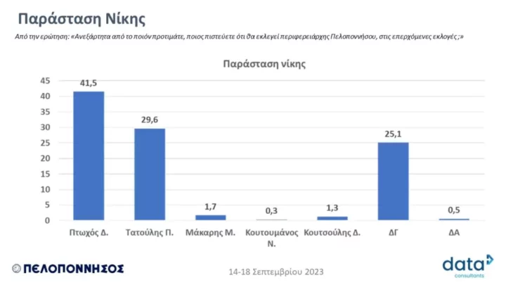 Οι πολίτες της Περιφέρειας Πελοποννήσου σε ποσοστό 41,5% θεωρούν ότι θα κερδίσει τις εκλογές ο Δ. Πτωχός και μόλις σε ποσοστό 29,6% ότι θα κερδίσει ο Π. Τατούλης.