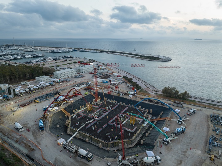 Η LAMDA Development μετά την ολοκλήρωση της τοποθέτησης 111 πασσάλων, διαμέτρου 1,5 μέτρου, σε βάθος 50 μέτρων, προχώρησε στο καθοριστικό βήμα για την ολοκλήρωση της θεμελίωσης του Riviera Tower, του πρώτου πράσινου ουρανοξύστη στην χώρα μας, ύψους 200 μέτρων και 50 ορόφων.