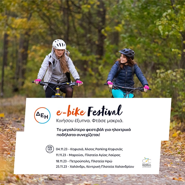Το πρώτο και μεγαλύτερο φεστιβάλ αποκλειστικά για ηλεκτρικά ποδήλατα, το ΔΕΗ e-bike Festival, απευθύνεται σε όλους, δίνοντας τη δυνατότητα δωρεάν δοκιμών σε μια σειρά από διαφορετικές κατηγορίες ποδηλάτων με ηλεκτρική υποβοήθηση. Στόχος είναι οι ενδιαφερόμενοι να βρουν τον τύπο ποδηλάτου που ταιριάζει περισσότερο στις δικές τους ανάγκες, κάνοντας πιο εύκολη, πιο πράσινη και βιώσιμη τη μετακίνησή τους στην πόλη ή επιλέγοντας έναν διαφορετικό τρόπο άσκησης και ψυχαγωγίας.