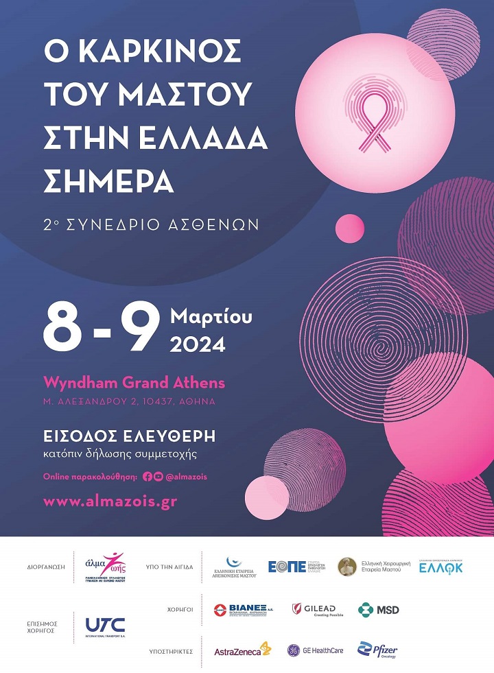 Το 2ο Συνέδριο Ασθενών «Ο καρκίνος του μαστού στην Ελλάδα σήμερα» διοργανώνεται από τον Πανελλήνιο Σύλλογο Γυναικών με Καρκίνο Μαστού «Άλμα Ζωής» υπό την Αιγίδα της Ελληνικής Εταιρείας Απεικόνισης Μαστού (ΕΕΑΜ), της Εταιρείας Ογκολόγων Παθολόγων Ελλάδας (ΕΟΠΕ), της Ελληνικής Χειρουργικής Εταιρείας Μαστού (ΕΧΕΜ) και της Ελληνικής Ομοσπονδίας Καρκίνου (ΕΛΛΟΚ).
