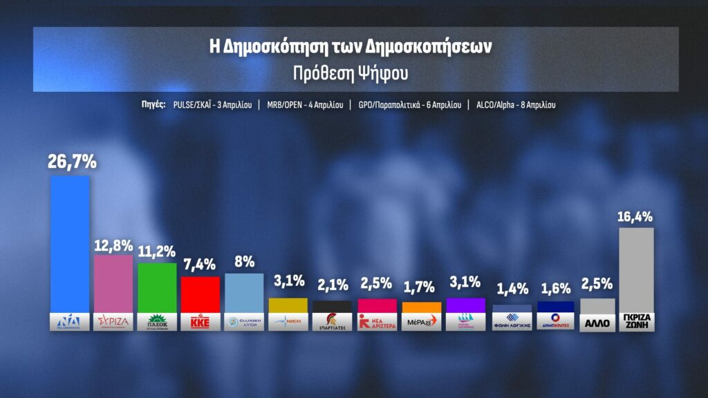 Τα στοιχεία προέρχονται από τις εταιρείες Pulse (ΣΚΑΪ), MRB (OPEN), GPO (Παραπολιτικά), Alco (ALPHA)