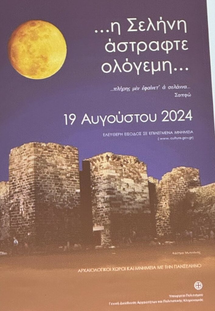 Τον στίχο της Σαπφώς «πλήρης μεν εφαινετ’ α σελάνα» (η σελήνη άστραφτε ολόγεμη) έχει ως γενικό τίτλο το πρόγραμμα του υπουργείου Πολιτισμού για τις νύχτες με πανσέληνο σε αρχαιολογικούς χώρους και μουσεία. Είναι ένα πρόγραμμα που διεξάγεται εδώ και πάρα πολλά χρόνια με μεγάλη επιτυχία, και έχει αγκαλιαστεί από το κοινό.