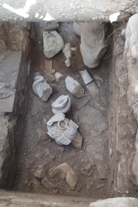 Η επαναφορά στο φως από την αχλύ αιώνων ολόγλυφων αγαλμάτων κατά τη “Η εντατική έρευνα που διενεργήθηκε, υπό εξαιρετικά δύσκολες συνθήκες, δεδομένου ότι περιορίστηκε στην περιοχή επέμβασης του τεχνικού έργου, έδειξε ότι τα αγάλματα, προερχόμενα από δύο συντάγματα, είχαν σκοπίμως αποκρυβεί εντός κτιστής κατασκευής ορθογωνίου σχήματος, κατασκευασμένης από οπτόπλινθους και κροκαλοπαγείς λιθοπλίνθους σε β΄ χρήση. Ενδεχομένως ήταν είδος κρύπτης ή υπόγειος χώρος. Εκτός από τους κορμούς των γλυπτών και τις πλίνθους στήριξής τους, τα λοιπά μέλη βρέθηκαν κατακερματισμένα, ενώ τα κεφάλια των δύο αγαλμάτων είχαν τοποθετηθεί στη βόρεια στενή πλευρά της κατασκευής. Από το σύνολο των ευρημάτων φαίνεται ότι είναι δυνατή η αποκατάσταση της αρχικής συνθέσεως των συνταγμάτων και έχει ήδη ξεκινήσει η εκπόνηση σχετικής μελέτης από το Τμήμα Συντήρησης της Εφορείας.