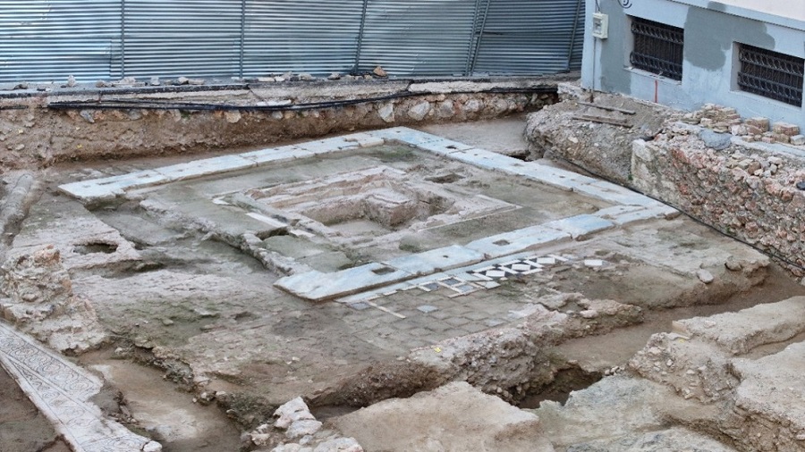 Όπως έχει διαπιστωθεί και από προγενέστερη αρχαιολογική διερεύνηση η περιοχή της Πλατείας Θεάτρου εμφανίζει πυκνά εργαστηριακά και οικιστικά κατάλοιπα, με διάρκεια χρήσης από τους ύστερους κλασικούς έως τους ύστερους ρωμαϊκούς χρόνους. Έτσι δεν αποτέλεσε έκπληξη η αποκάλυψη τμήματος σημαντικού οικοδομήματος των χρόνων αυτών (πιθανότατα τμήμα αστικής έπαυλης ή διδακτηρίου) που αποτελείται από έναν κεντρικό αίθριο τετράγωνο χώρο με βαθμιδωτή δεξαμενή τετράγωνης κάτοψης στο κέντρο του. Ο χώρος σχημάτιζε περιμετρικά στοές, τα δάπεδα των οποίων κοσμούνται με μαρμαροθετήματα (opus sectile) που φέρουν γεωμετρικά μοτίβα. Εκατέρωθεν του περιστυλίου, προς ανατολάς και προς δυσμάς, διατηρήθηκαν ψηφιδωτά δάπεδα (opus tessellatum) από πολύχρωμες ψηφίδες με σχηματοποιημένα γεωμετρικά και φυτικά μοτίβα. Προγενέστερες έρευνες στην περιοχή καταδεικνύουν ότι η συνέχεια του οικοδομήματος έχει αποκαλυφθεί επί της Πλατείας Θεάτρου 6-8, ενώ δεν αποκλείεται να συνανήκουν και κατάλοιπα με ψηφιδωτά δάπεδα επί της οδού Ευριπίδου.