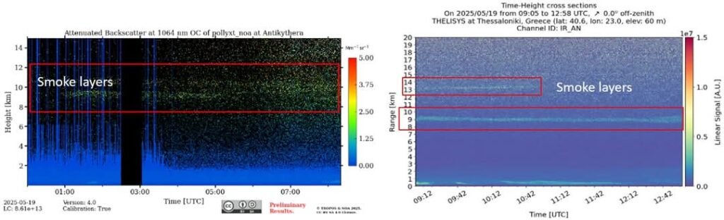 Σε εικόνες που επισυνάπτονται αποτυπώνονται (εικόνα 1) οι στρωματώσεις καπνού (μέσα στα κόκκινα πλαίσια), όπως καταγράφηκαν από τους σταθμούς lidar του παρατηρητηρίου ΠΑΓΓΑΙΑ στα Αντικύθηρα και του Εργαστηρίου Φυσικής της Ατμόσφαιρας του ΑΠΘ στη Θεσσαλονίκη.