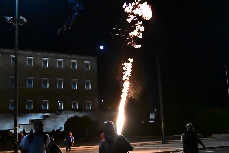 Επεισόδια ξέσπασαν στην Πλατεία Συντάγματος μετά το τέλος της συγκέντρωσης διαμαρτυρίας που πραγματοποιήθηκε από τον σύλλογο πληγέντων του σιδηροδρομικού δυστυχήματος στα Τέμπη.