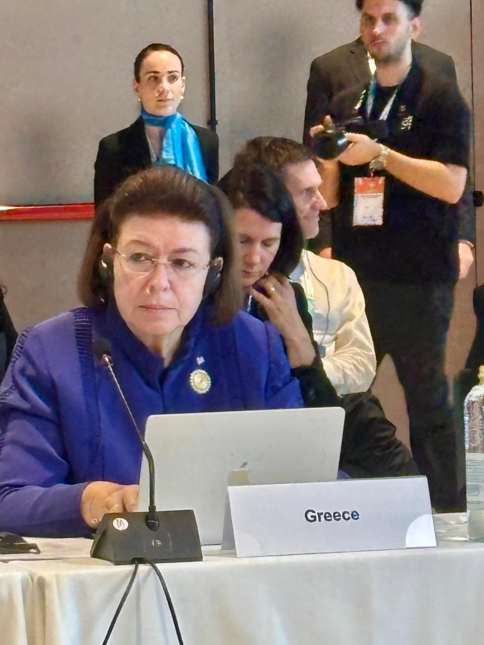 Η Υπουργός Πολιτισμού υπογράμμισε «την ανάγκη να ενσωματωθεί ο πολιτισμός και η πολιτιστική κληρονομιά στα Εθνικά Σχέδια Προσαρμογής των Κρατών Μελών στην Κλιματική Αλλαγή, καθώς και στη Στρατηγική για τη Δίκαιη Μετάβαση, καλώντας, παράλληλα τα μέλη της Συμμαχίας να υιοθετήσουν τους δείκτες για την πολιτιστική κληρονομιά, που προετοιμάστηκαν στο πλαίσιο του Παγκόσμιου Στόχου για την Προσαρμογή των Ηνωμένων Εθνών, καθώς η χρήση τους καθιστά μετρήσιμη την πρόοδο των Εθνικών Σχεδίων, για την προσαρμογή της πολιτιστικής κληρονομιάς στην κλιματική αλλαγή». Σημείωσε την ανάγκη μείωσης του ανθρακικού αποτυπώματος του πολιτιστικού και δημιουργικού τομέα, μέσω της πράσινης μετάβασης. Τέλος, αναφέρθηκε στις διεθνείς πρωτοβουλίες της Ελλάδας για τον περιφερειακό συντονισμό, ως προς την κλιματική αλλαγή, και τόνισε ότι η Ελλάδα είναι έτοιμη να μοιραστεί την εμπειρία και τεχνογνωσία της.